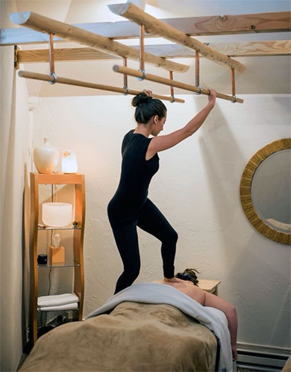 The therapist supports themselves using bars on the ceiling while applying weight with their feet, allowing for: