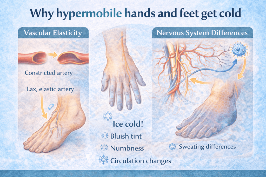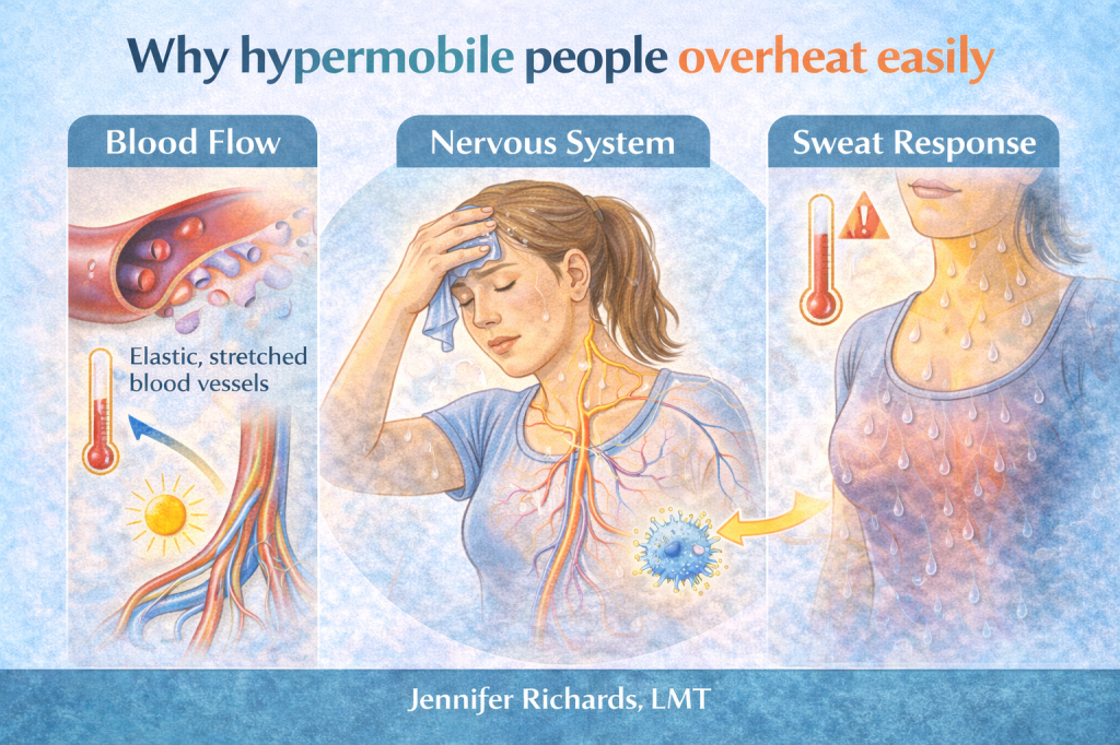 Hypermobility conditions such as Ehlers-Danlos Syndrome (EDS) can affect connective tissue throughout the body, including structures that help regulate blood vessels and circulation. When these systems behave differently, temperature regulation can sometimes be affected.