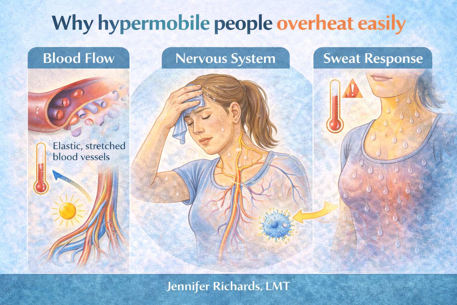 In hypermobile individuals, blood vessels may be more elastic due to connective tissue differences. This can affect circulation and the body’s ability to regulate temperature effectively.
